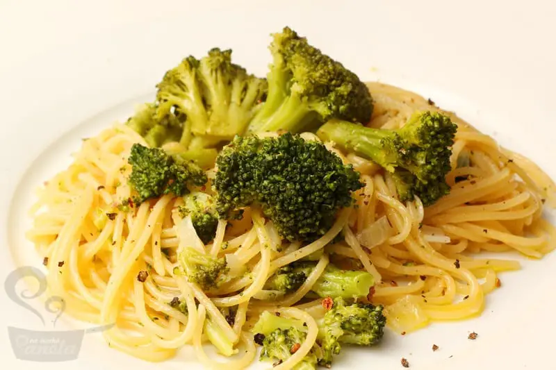 Cozinhe o brócolis no vapor e reserve. Cozinhe o espaguete até ficar al dente e escorra. Enquanto isso, aqueça o azeite numa panela funda, acrescente o alho e deixe dourar um pouquinho. Adicione a cebola picada e quando ela começar a ficar transparente, junte o brócolis cozido previamente, envolvendo-o no azeite. Tempere com sal a gosto, e por último misture o macarrão. Na hora de servir, salpique com a pimenta-do-reino.