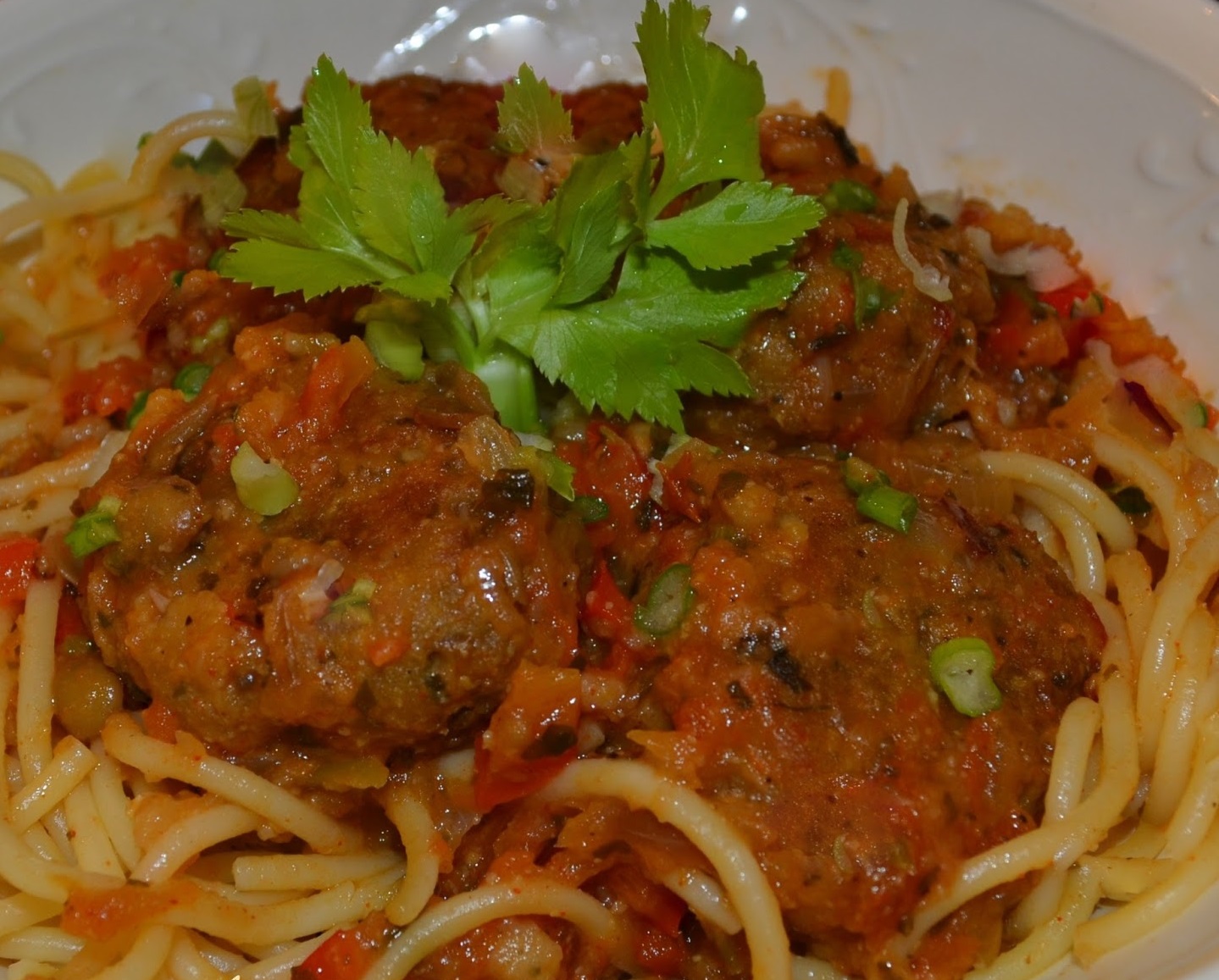 Tome cuidado para que elas não grudem no fundo da frigideira. Vire quando necessário para que elas cozinhem por igual e peguem a corzinha do molho de tomates. Jogue a salsa e cebolinha sobre as almôndegas no molho e misture delicadamente.